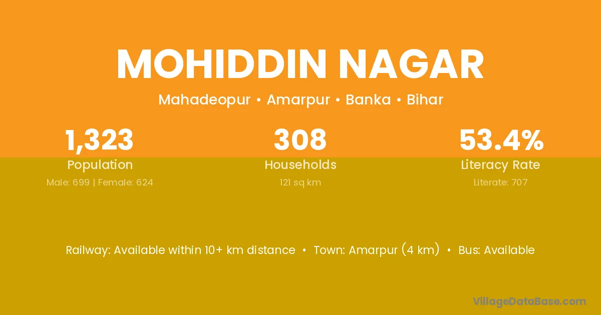 Mohiddin Nagar village has a total population of 1,323 people, of which 699 are males and 624 are females.