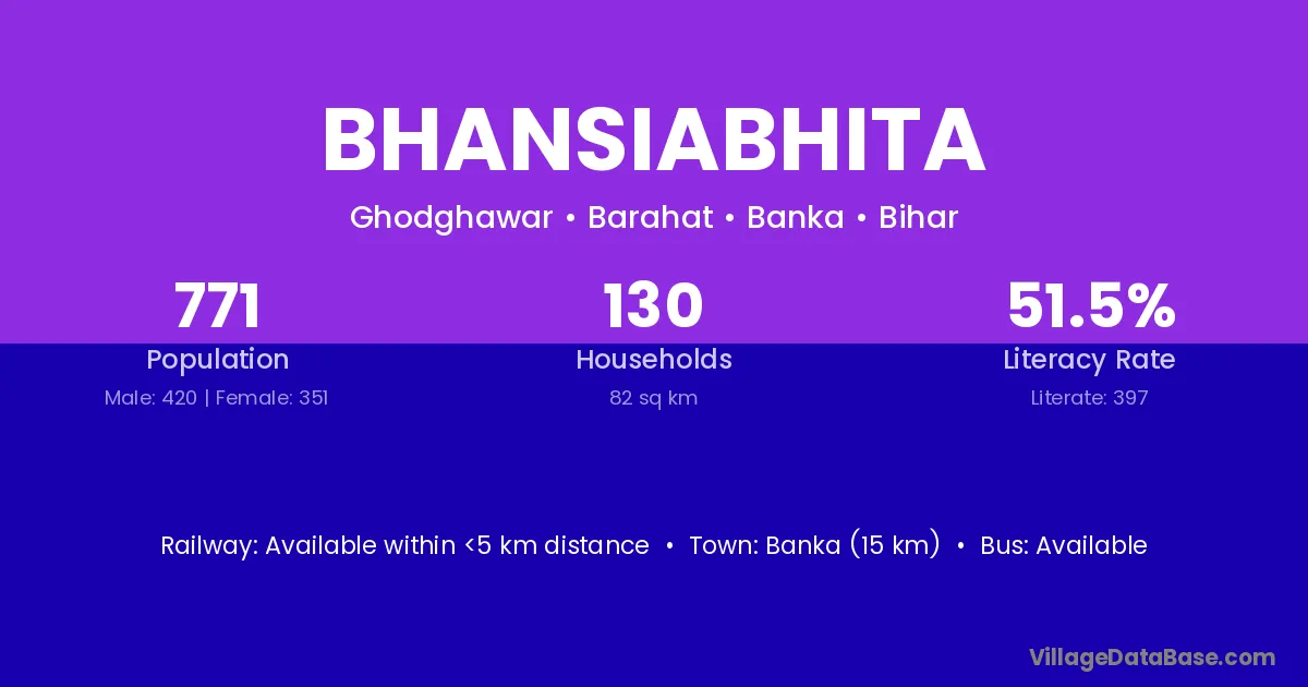 Banka (15 km) is the nearest town to Bhansiabhita village for major economic activities and is located approximately 15 km away.