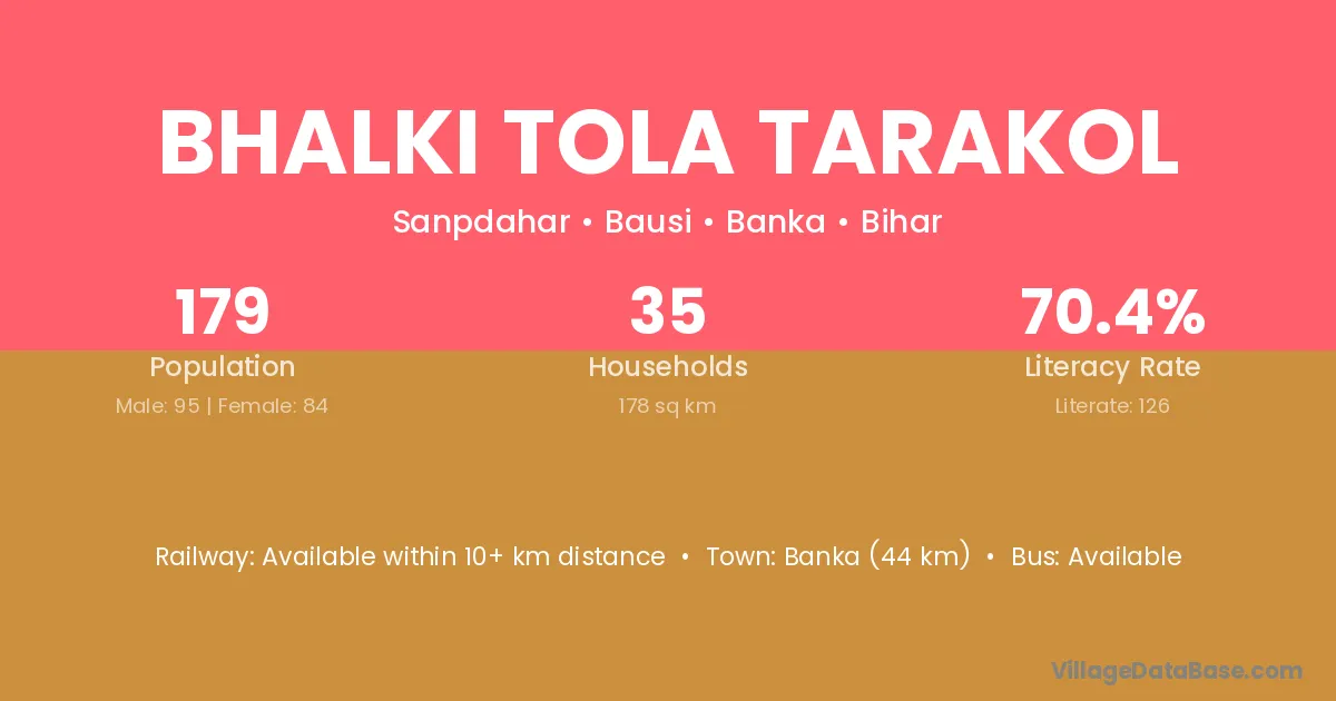 Banka (44 km) is the nearest town to Bhalki Tola Tarakol village for major economic activities and is located approximately 44 km away.