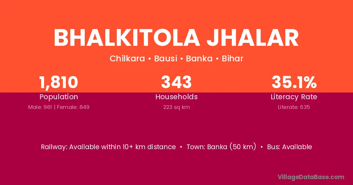 Banka (50 km) is the nearest town to Bhalkitola Jhalar village for major economic activities and is located approximately 50 km away.
