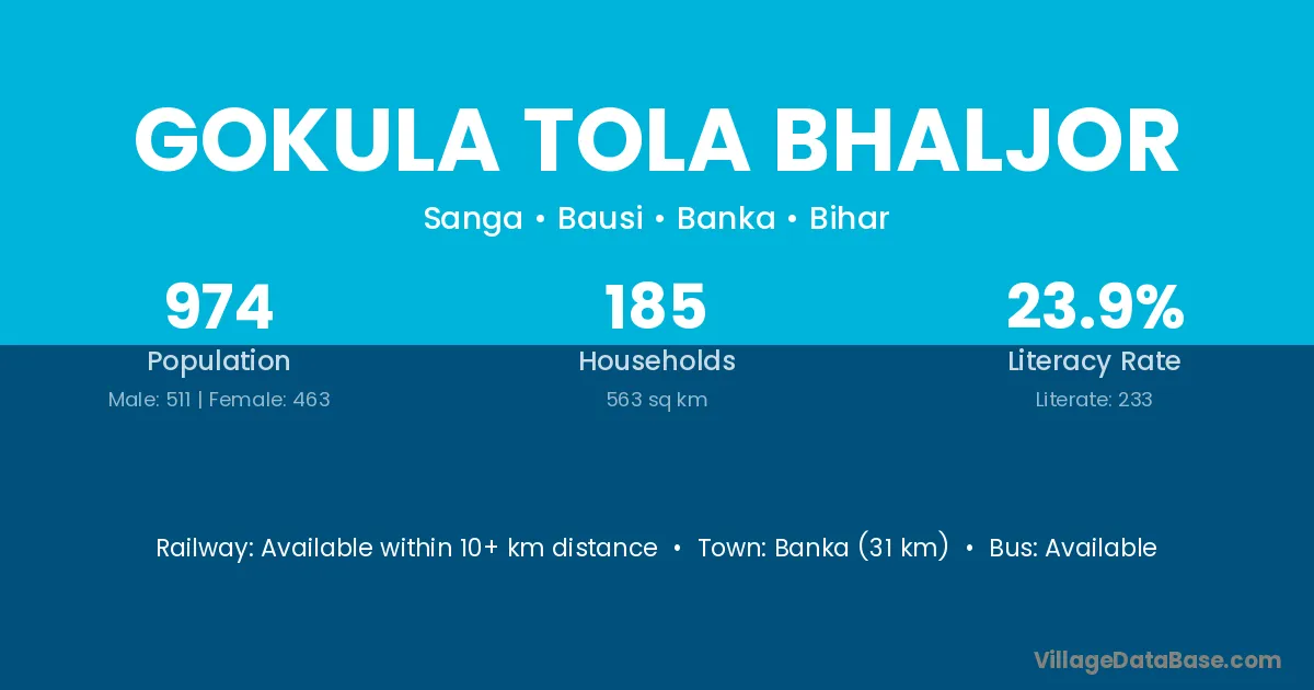 Banka (31 km) is the nearest town to Gokula Tola Bhaljor village for major economic activities and is located approximately 31 km away.