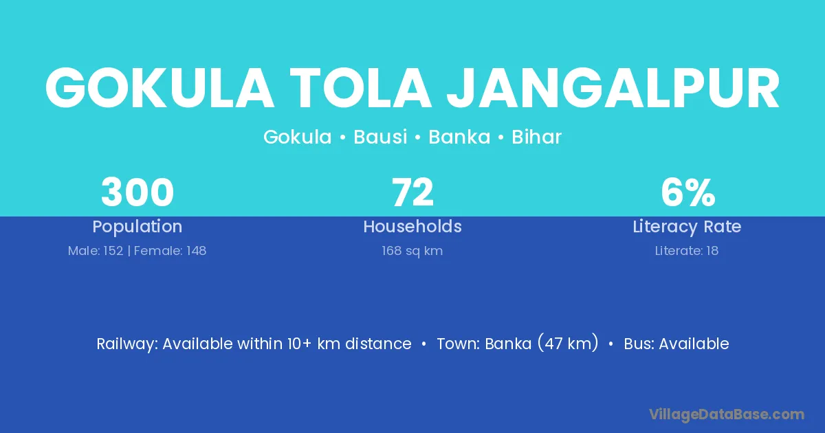 Banka (47 km) is the nearest town to Gokula Tola Jangalpur village for major economic activities and is located approximately 47 km away.
