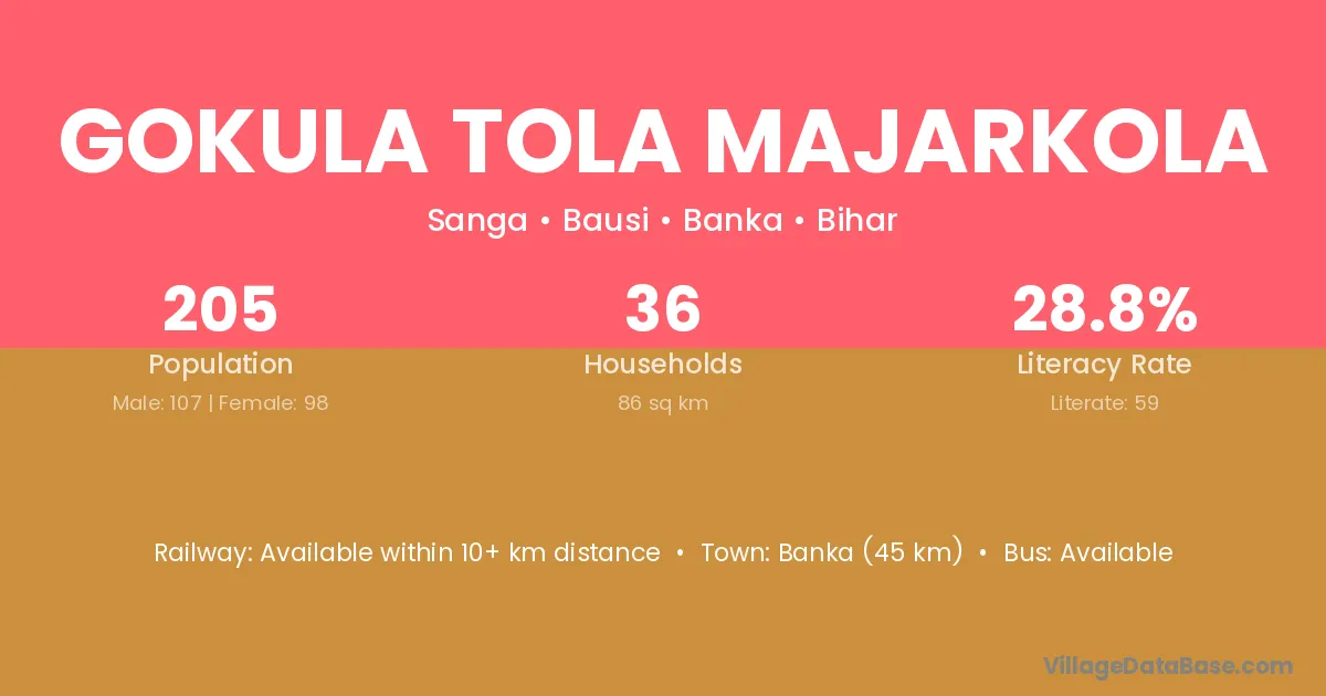 Banka (45 km) is the nearest town to Gokula Tola Majarkola village for major economic activities and is located approximately 45 km away.
