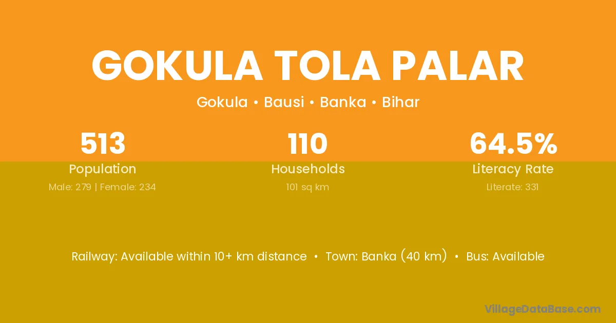 Banka (40 km) is the nearest town to Gokula Tola Palar village for major economic activities and is located approximately 40 km away.