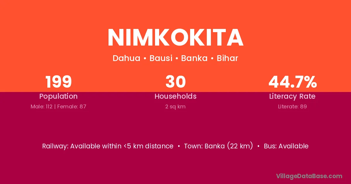 Banka (22 km) is the nearest town to Nimkokita village for major economic activities and is located approximately 22 km away.