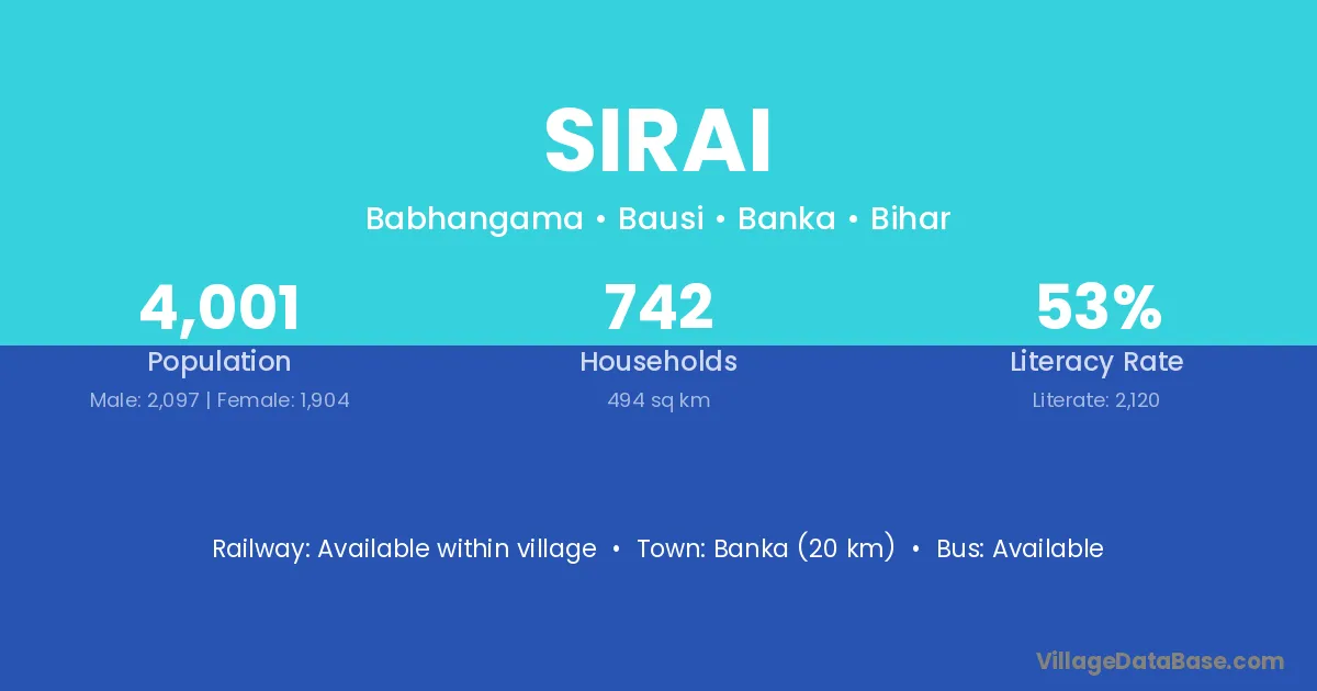 Banka (20 km) is the nearest town to Sirai village for major economic activities and is located approximately 20 km away.