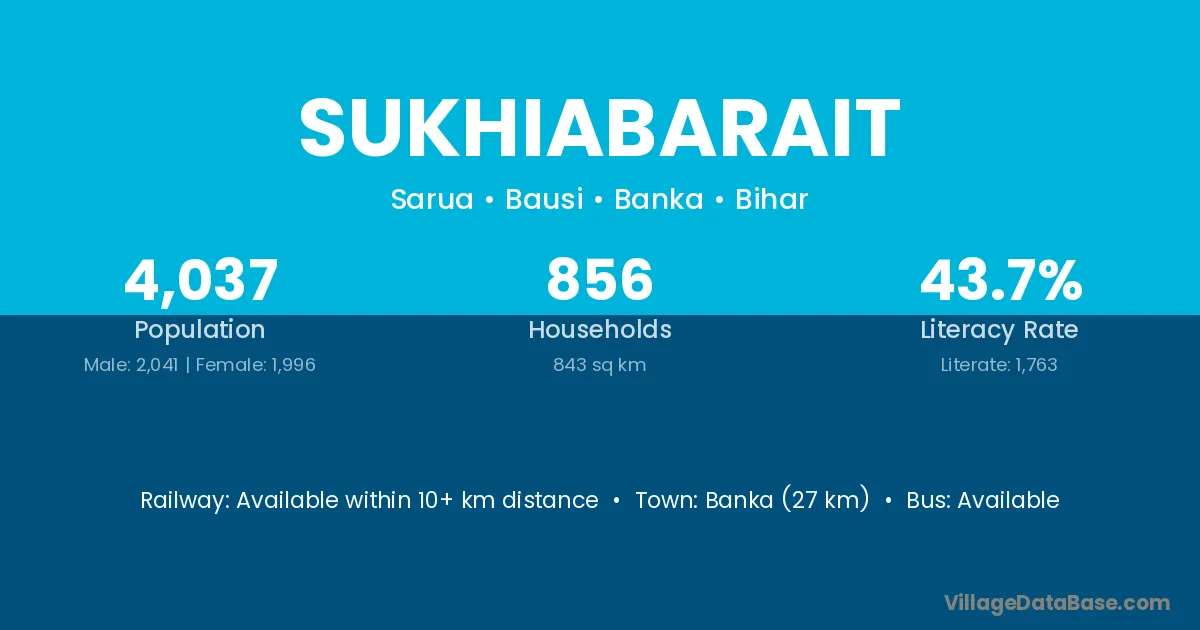 Banka (27 km) is the nearest town to Sukhiabarait village for major economic activities and is located approximately 27 km away.