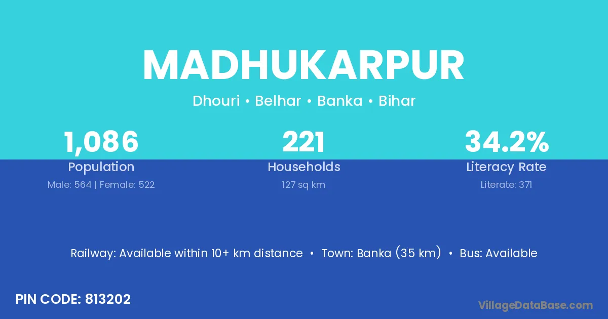Banka (35 km) is the nearest town to Madhukarpur village for major economic activities and is located approximately 35 km away.