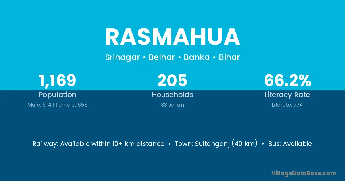 Sultanganj (40 km) is the nearest town to Rasmahua village for major economic activities and is located approximately 40 km away.