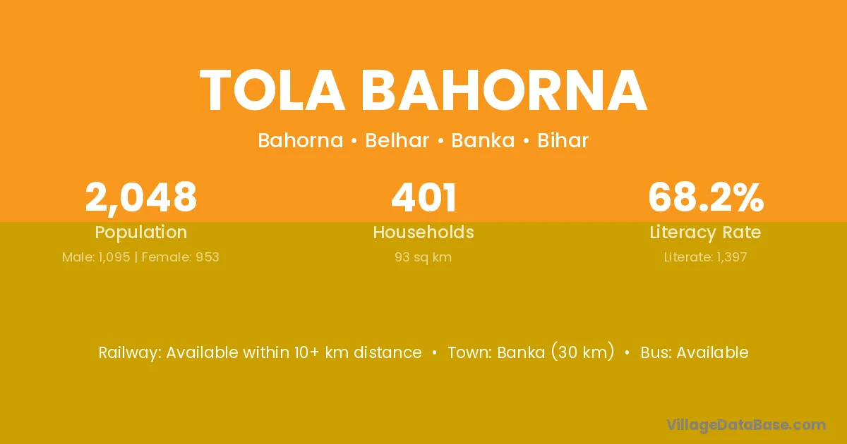 Banka (30 km) is the nearest town to Tola Bahorna village for major economic activities and is located approximately 30 km away.