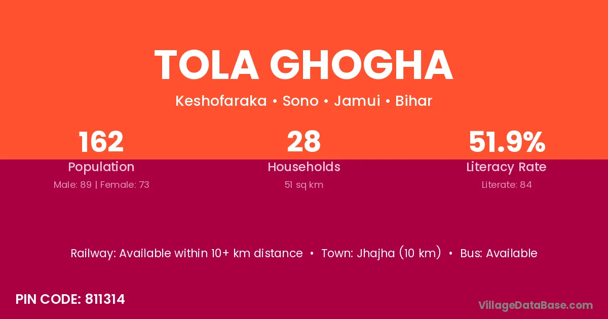 Sultanganj (50 km) is the nearest town to Tola Ghogha village for major economic activities and is located approximately 50 km away.