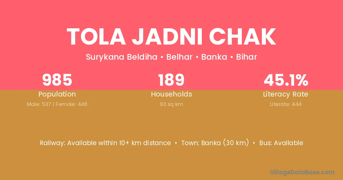 Banka (30 km) is the nearest town to Tola Jadni Chak village for major economic activities and is located approximately 30 km away.