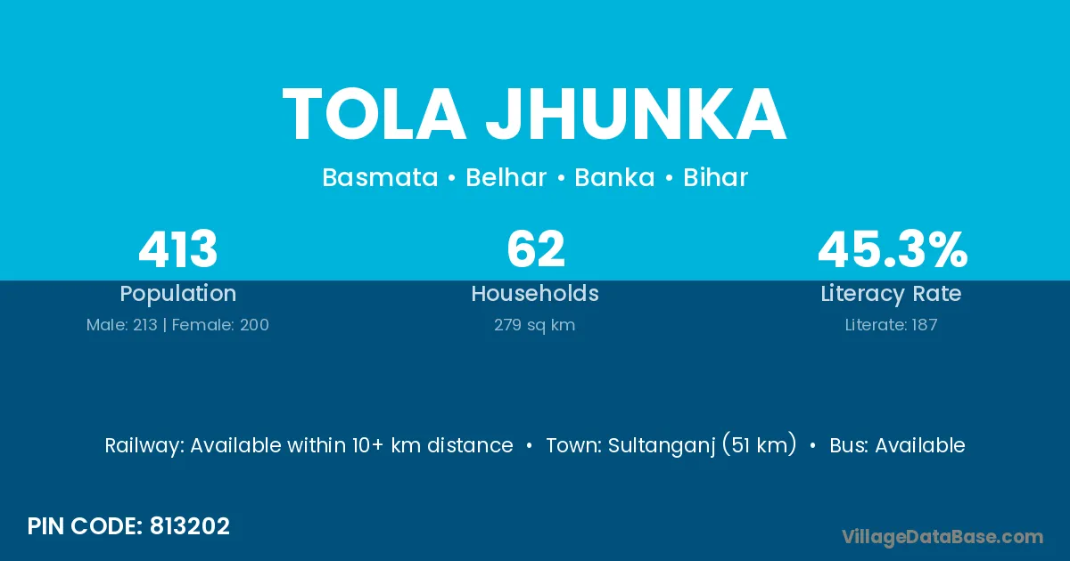 Sultanganj (51 km) is the nearest town to Tola Jhunka village for major economic activities and is located approximately 51 km away.