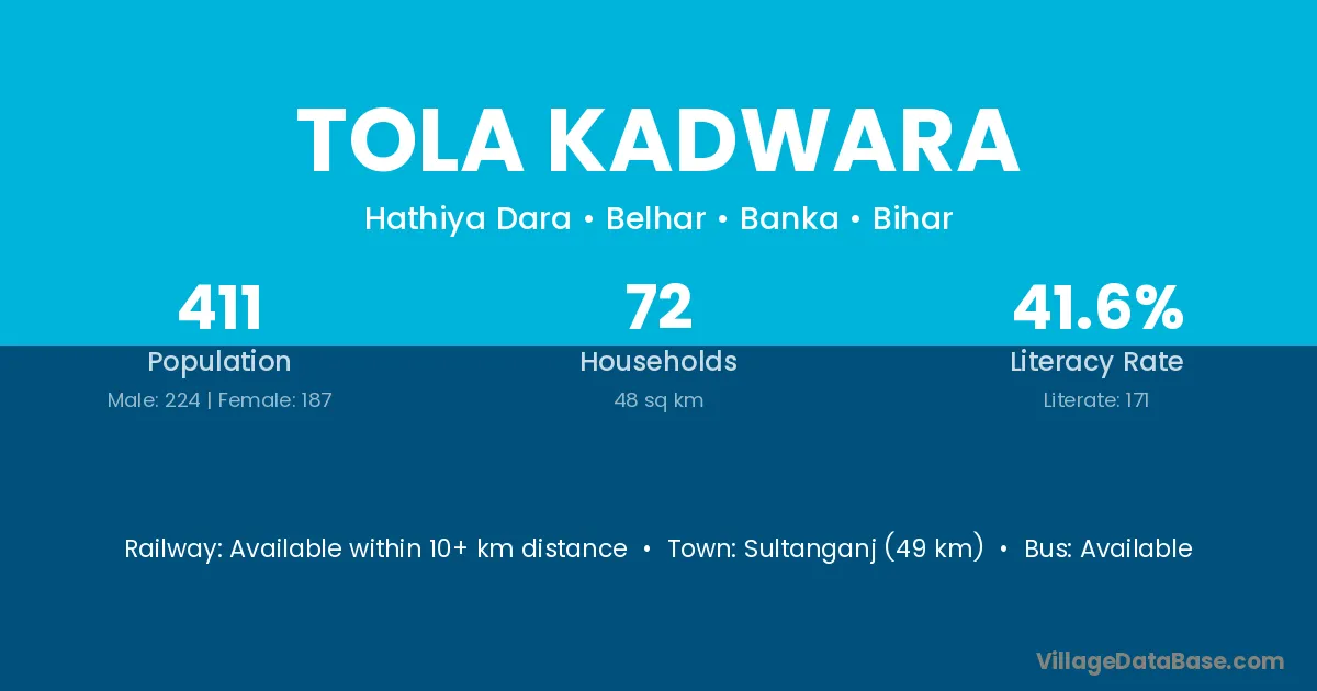 Sultanganj (49 km) is the nearest town to Tola Kadwara village for major economic activities and is located approximately 49 km away.