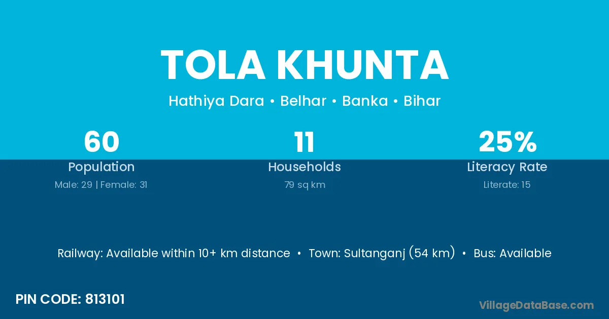 Tola Khunta village has a total population of 60 people, of which 29 are males and 31 are females.