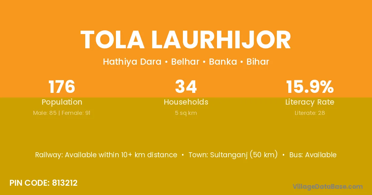 Sultanganj (50 km) is the nearest town to Tola Laurhijor village for major economic activities and is located approximately 50 km away.