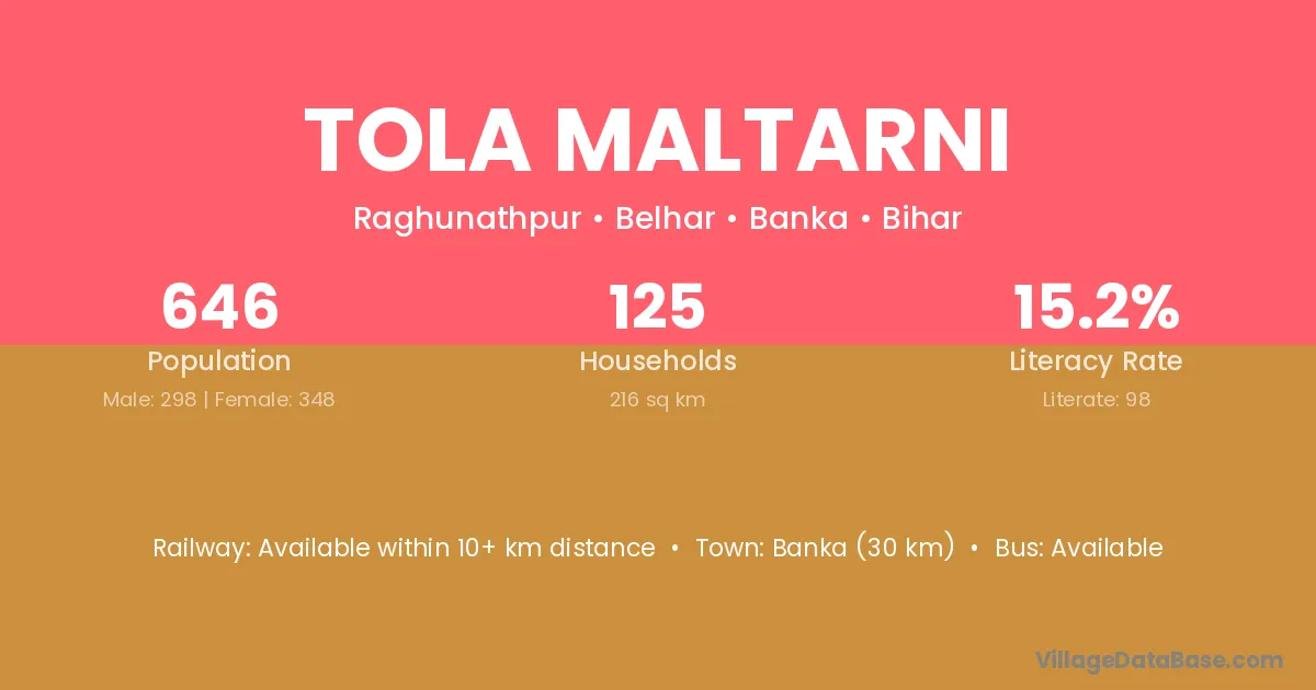 Banka (30 km) is the nearest town to Tola Maltarni village for major economic activities and is located approximately 30 km away.