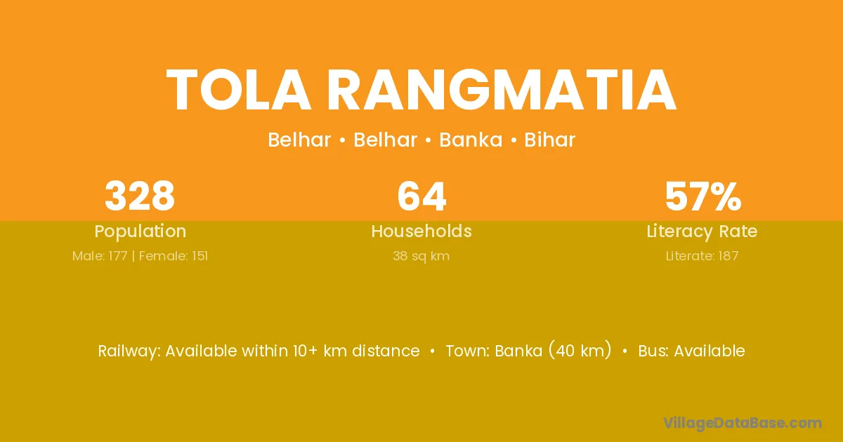 Banka (40 km) is the nearest town to Tola Rangmatia village for major economic activities and is located approximately 40 km away.