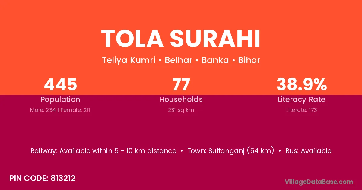 Sultanganj (54 km) is the nearest town to Tola Surahi village for major economic activities and is located approximately 54 km away.