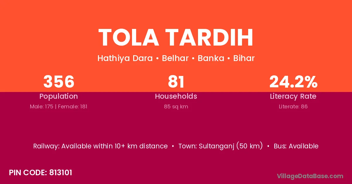 Sultanganj (50 km) is the nearest town to Tola Tardih village for major economic activities and is located approximately 50 km away.