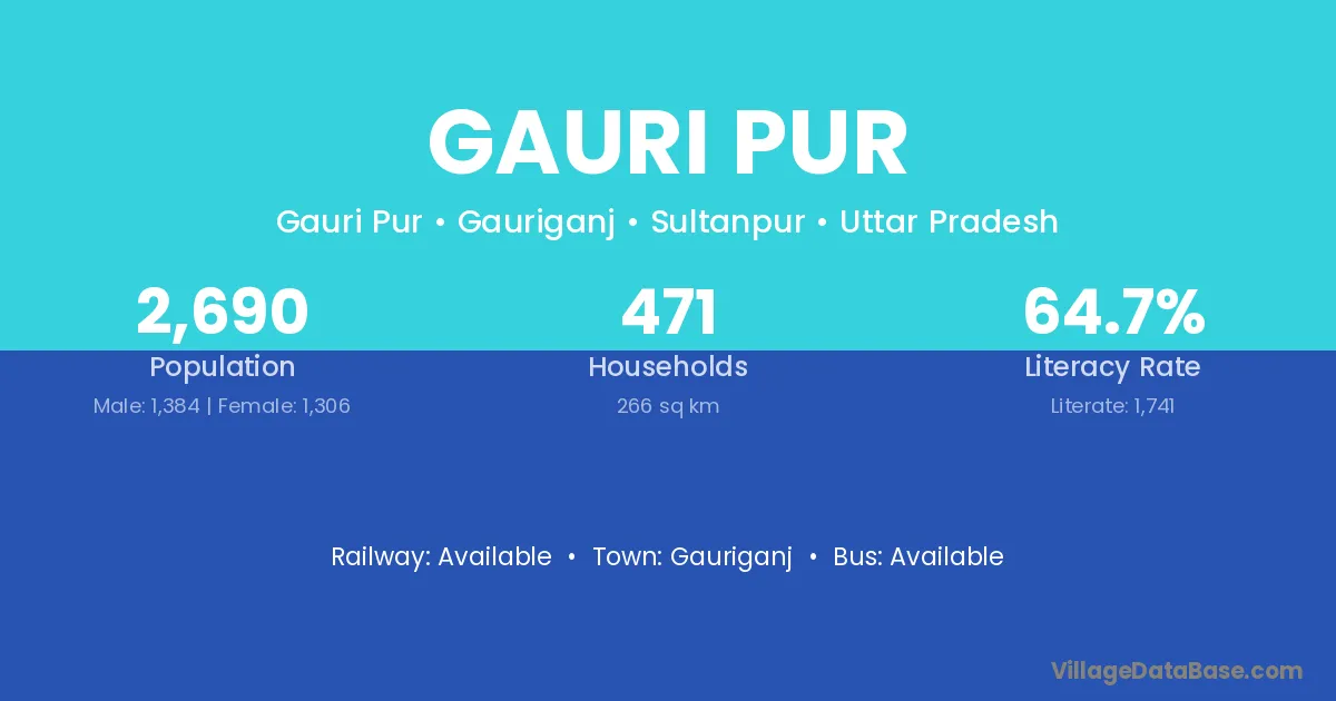 The literacy rate of Gauri Pur village is 41.30%. Male literacy stands at 50.20% and female literacy at 31.49%.