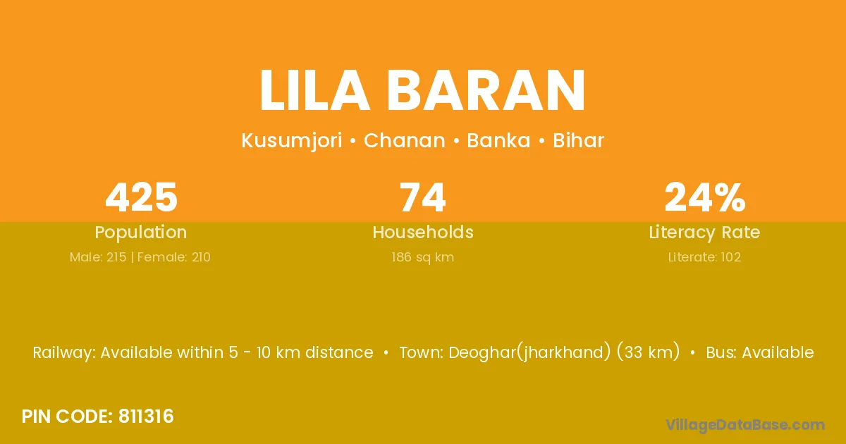 Deoghar(jharkhand) (33 km) is the nearest town to Lila Baran village for major economic activities and is located approximately 33 km away.