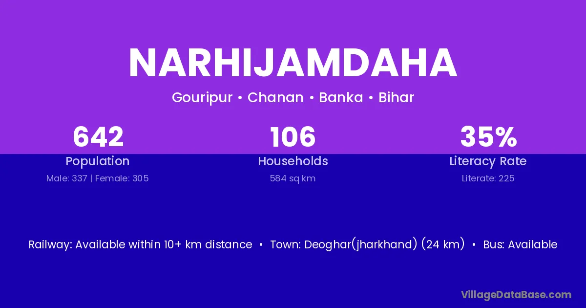 Deoghar(jharkhand) (24 km) is the nearest town to Narhijamdaha village for major economic activities and is located approximately 24 km away.
