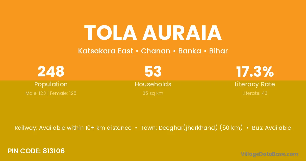Deoghar(jharkhand) (50 km) is the nearest town to Tola Auraia village for major economic activities and is located approximately 50 km away.