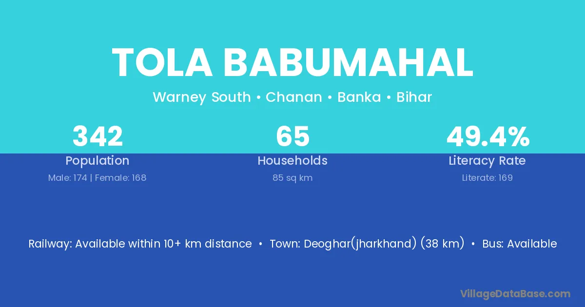 Deoghar(jharkhand) (38 km) is the nearest town to Tola Babumahal village for major economic activities and is located approximately 38 km away.