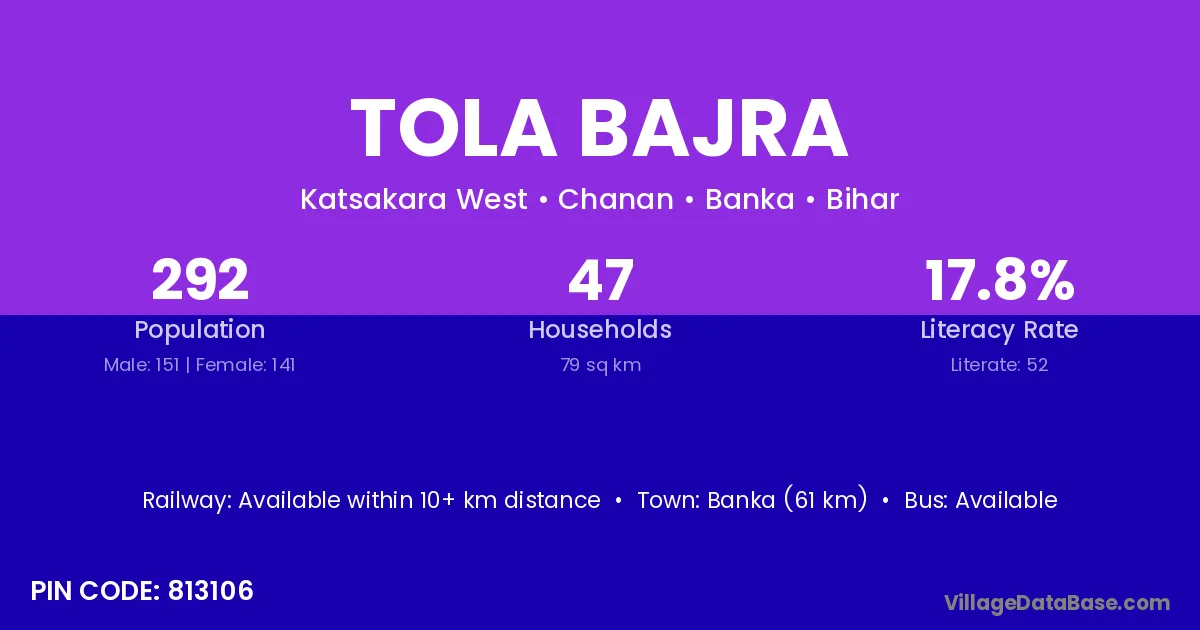 Banka (61 km) is the nearest town to Tola Bajra village for major economic activities and is located approximately 61 km away.