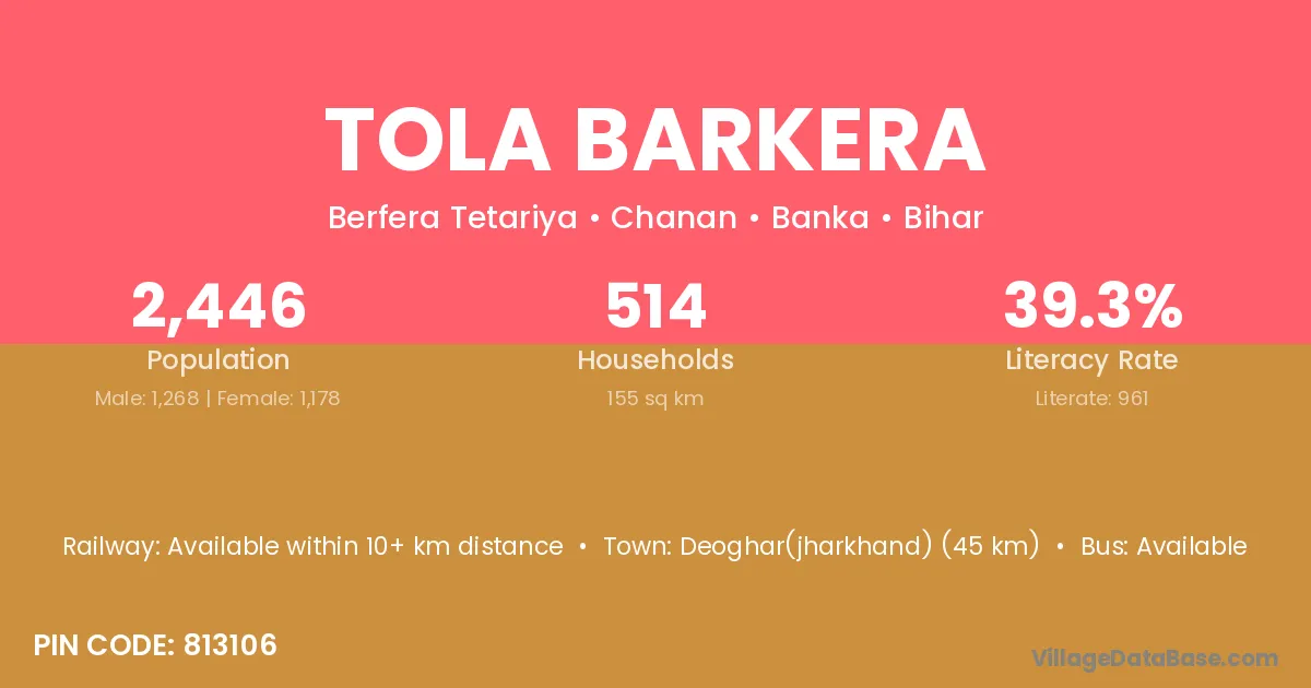Deoghar(jharkhand) (45 km) is the nearest town to Tola Barkera village for major economic activities and is located approximately 45 km away.