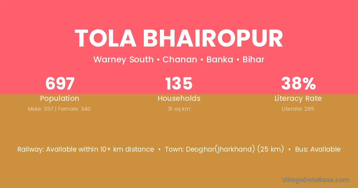 Deoghar(jharkhand) (25 km) is the nearest town to Tola Bhairopur village for major economic activities and is located approximately 25 km away.