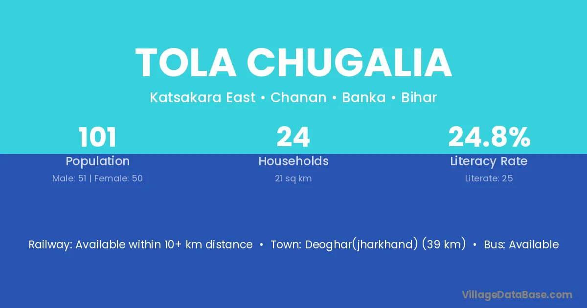 Deoghar(jharkhand) (39 km) is the nearest town to Tola Chugalia village for major economic activities and is located approximately 39 km away.