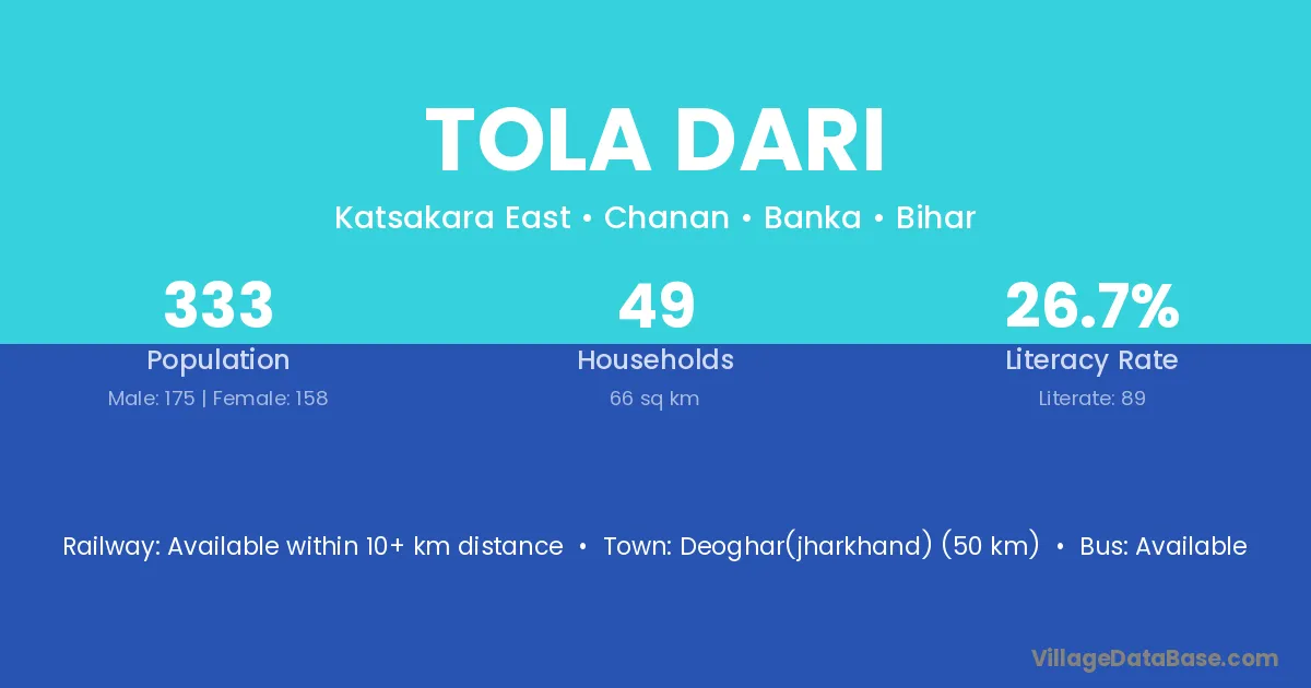 Deoghar(jharkhand) (50 km) is the nearest town to Tola Dari village for major economic activities and is located approximately 50 km away.