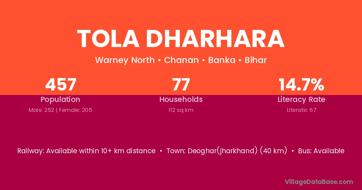 Deoghar(jharkhand) (40 km) is the nearest town to Tola Dharhara village for major economic activities and is located approximately 40 km away.