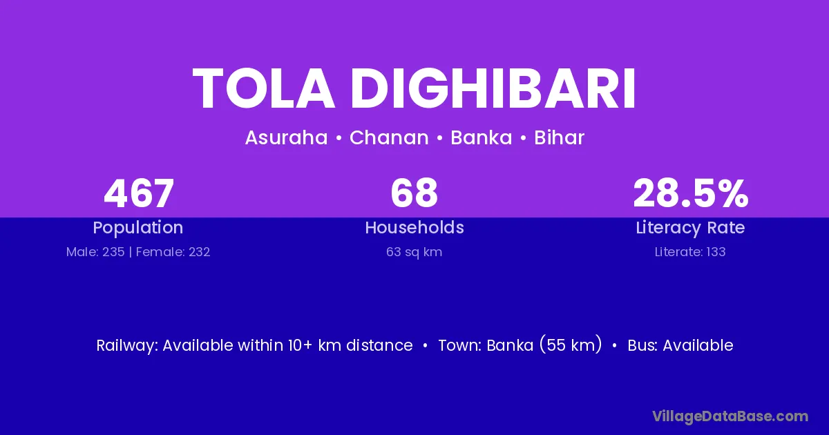 Banka (55 km) is the nearest town to Tola Dighibari village for major economic activities and is located approximately 55 km away.