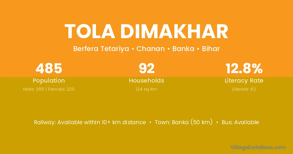 Banka (50 km) is the nearest town to Tola Dimakhar village for major economic activities and is located approximately 50 km away.