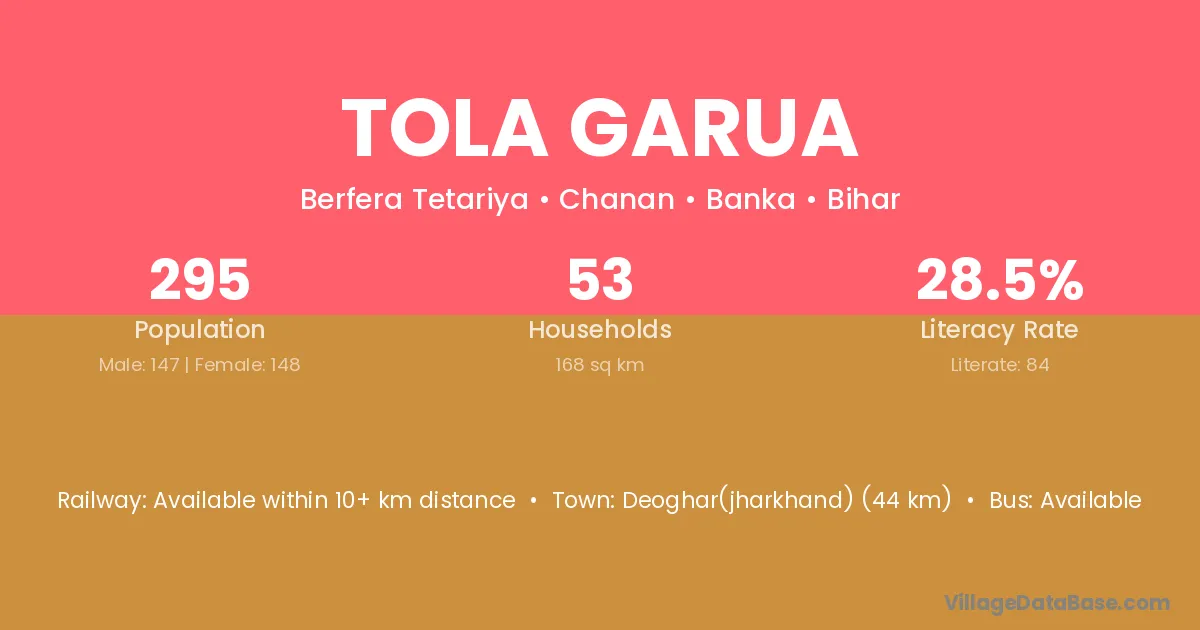 Deoghar(jharkhand) (44 km) is the nearest town to Tola Garua village for major economic activities and is located approximately 44 km away.
