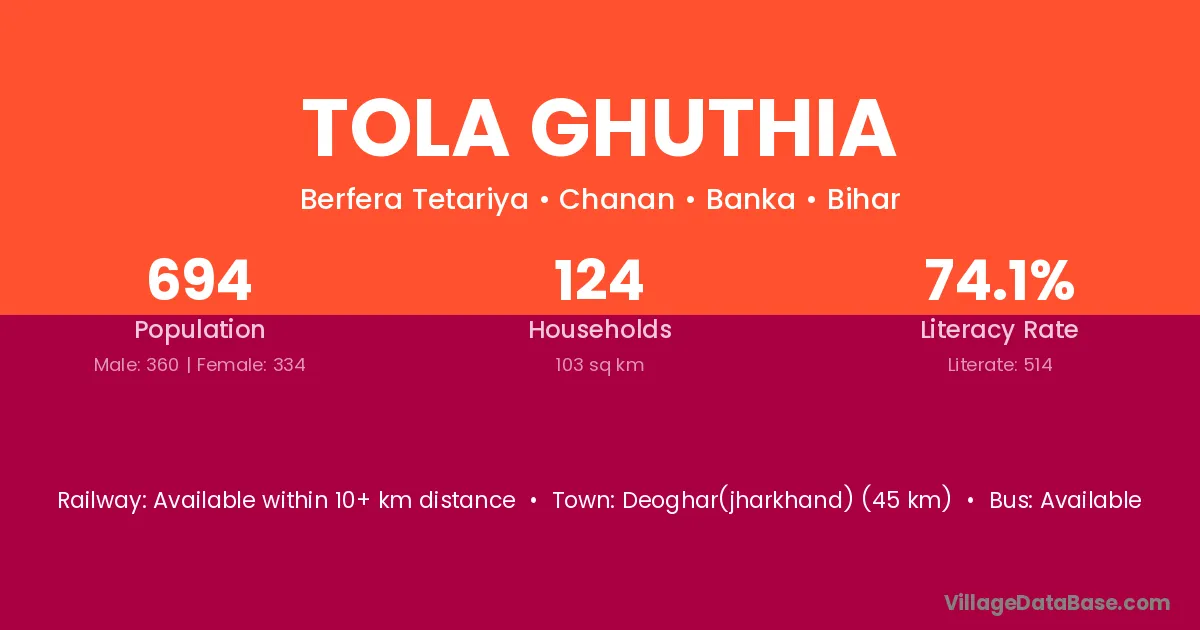 Deoghar(jharkhand) (45 km) is the nearest town to Tola Ghuthia village for major economic activities and is located approximately 45 km away.