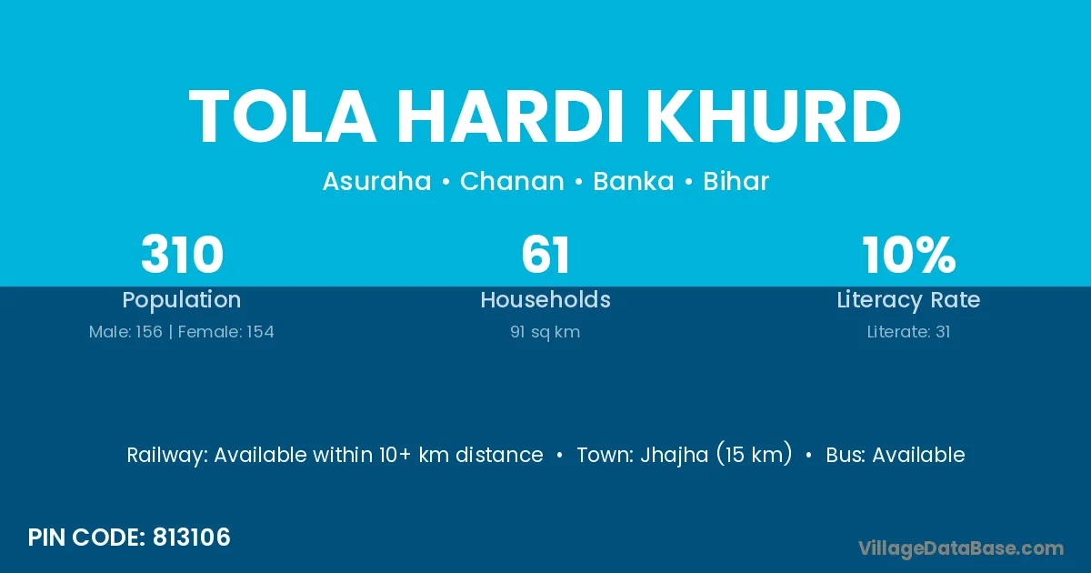 Jhajha (15 km) is the nearest town to Tola Hardi Khurd village for major economic activities and is located approximately 15 km away.