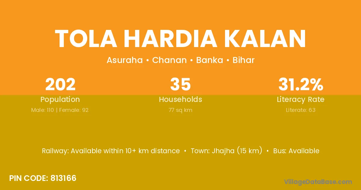 Jhajha (15 km) is the nearest town to Tola Hardia Kalan village for major economic activities and is located approximately 15 km away.