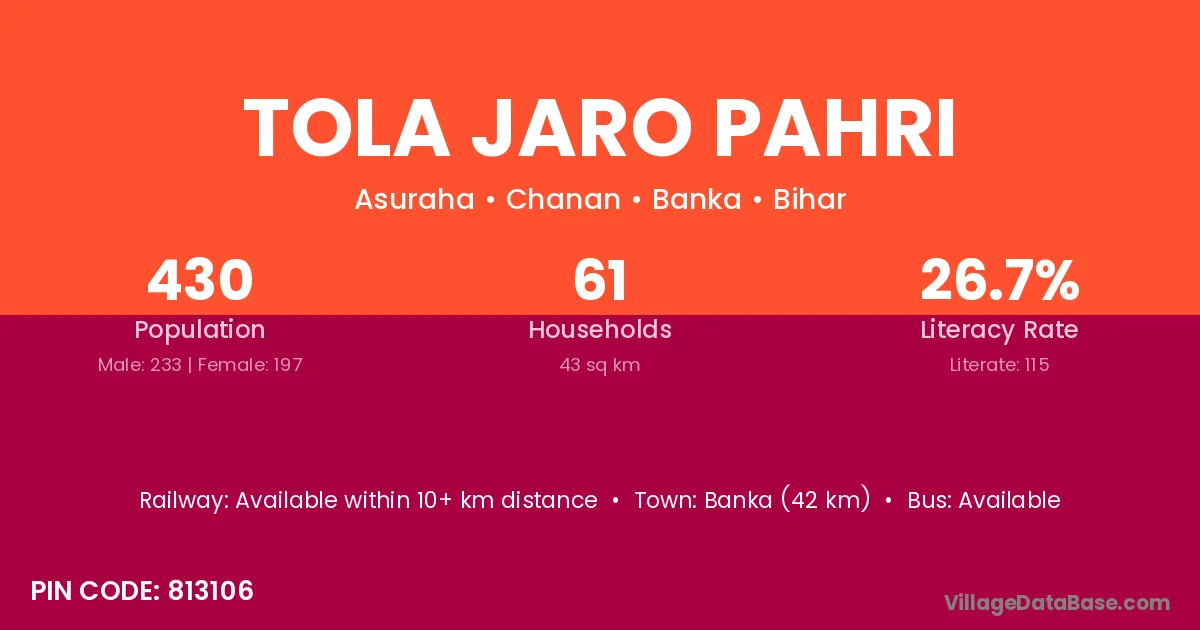 Banka (42 km) is the nearest town to Tola Jaro Pahri village for major economic activities and is located approximately 42 km away.