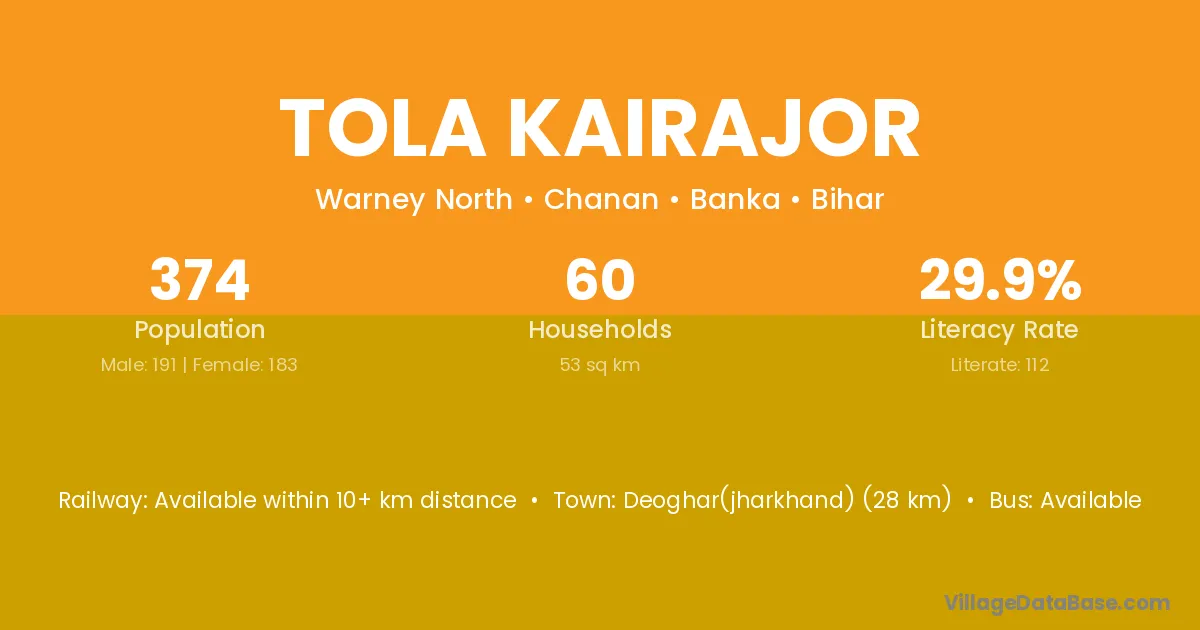 Deoghar(jharkhand) (28 km) is the nearest town to Tola Kairajor village for major economic activities and is located approximately 28 km away.