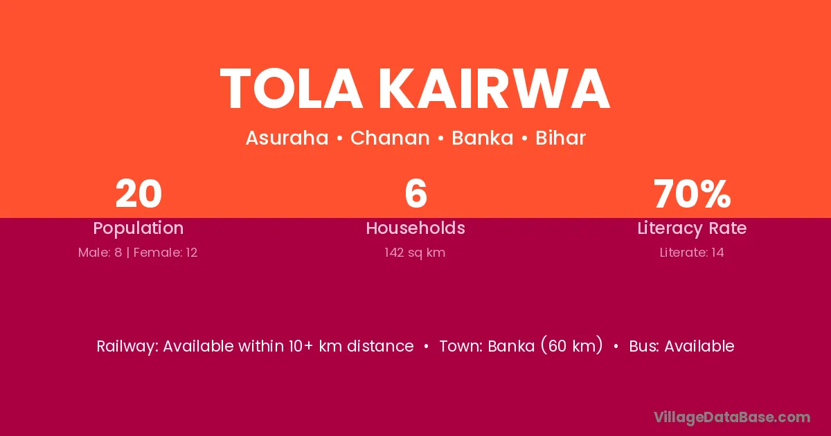 Banka (60 km) is the nearest town to Tola Kairwa village for major economic activities and is located approximately 60 km away.