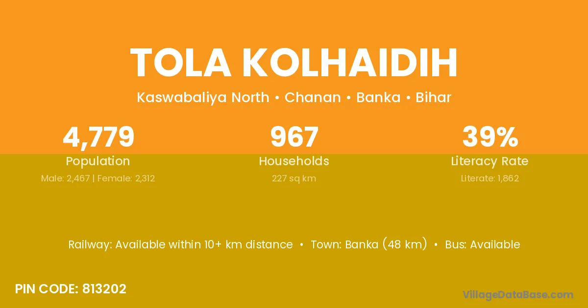 Banka (48 km) is the nearest town to Tola Kolhaidih village for major economic activities and is located approximately 48 km away.