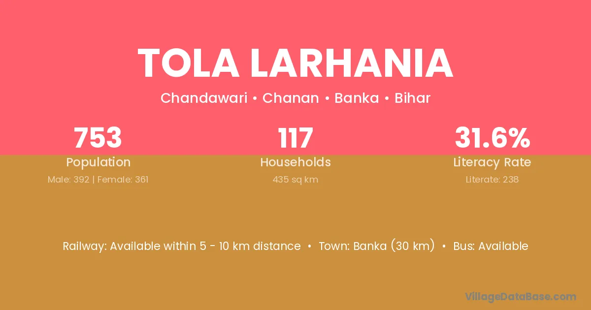 Banka (30 km) is the nearest town to Tola Larhania village for major economic activities and is located approximately 30 km away.