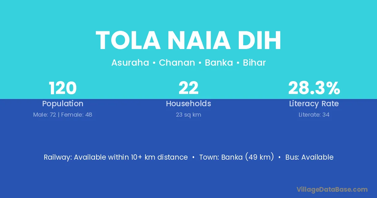 Banka (49 km) is the nearest town to Tola Naia Dih village for major economic activities and is located approximately 49 km away.