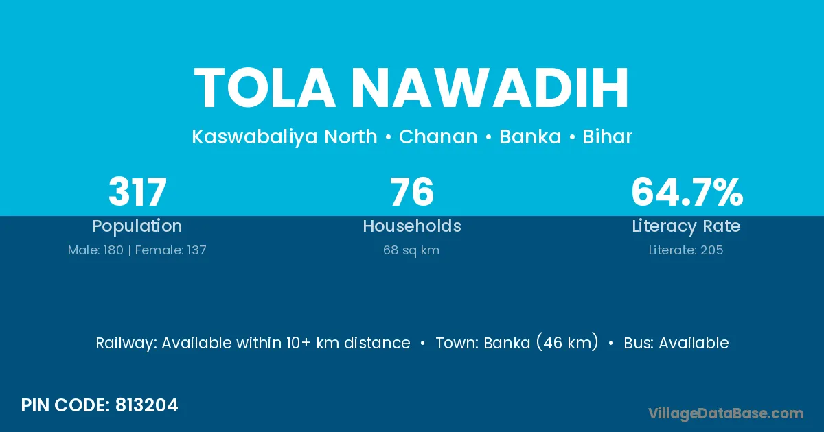 Banka (46 km) is the nearest town to Tola Nawadih village for major economic activities and is located approximately 46 km away.