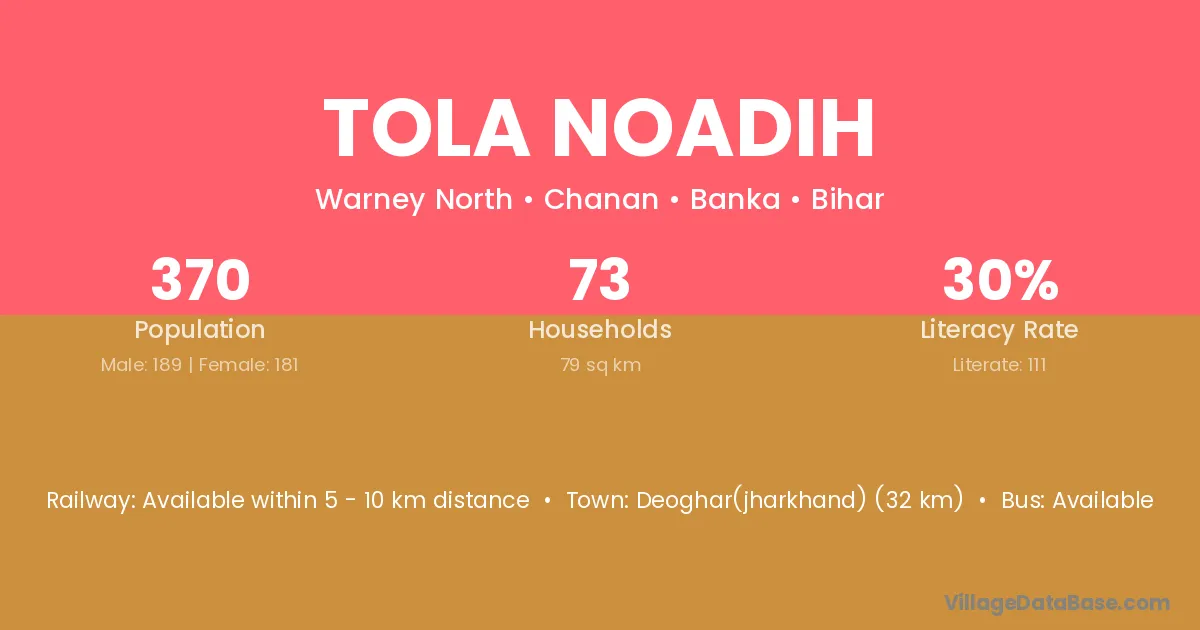 Deoghar(jharkhand) (32 km) is the nearest town to Tola Noadih village for major economic activities and is located approximately 32 km away.