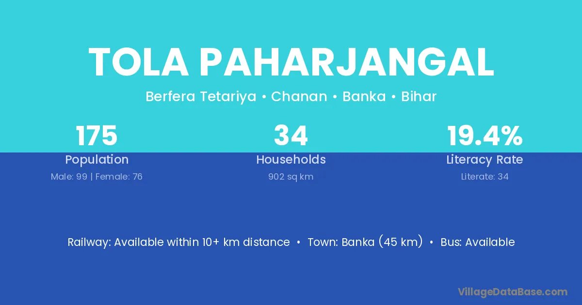 Banka (45 km) is the nearest town to Tola Paharjangal village for major economic activities and is located approximately 45 km away.